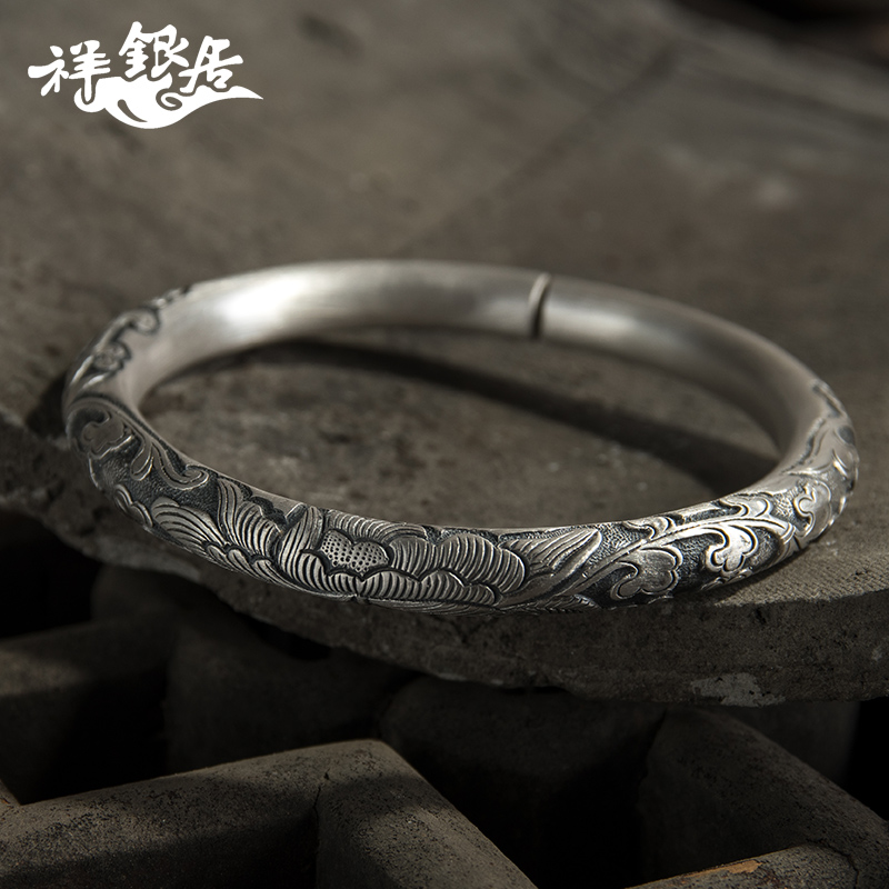 s999足银 云南雪花银 手工银饰 原创设计 凤凰牡丹花手镯 送爱人