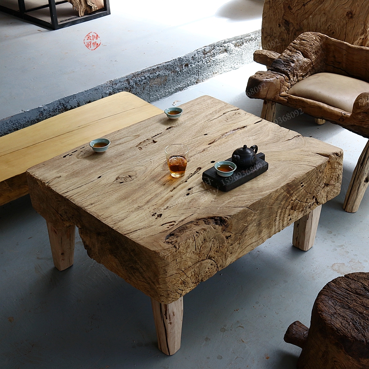 方形皮沙发原木茶几 实木边几 茶桌简约复古北欧风木桌设计师软装热门设计联盟服务商